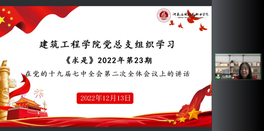 2022年12月13日下午,建筑工程学院党总支通过腾讯会议组织开展线上政治理论学习活动,集中学习了《求是》2022年第23期习近平总书记重要文章《在党的十九届七中全会第二次全体会议上的讲话》《习近平谈治国理政》第四卷、《全面从严治党向基层延伸》《习近平生态文文明思想学习纲要》《习近平经济思想学习纲要》等部分内容。会议由建筑工程学院党总支书记马春燕主持,院长张虎及全体教职工参加会议。