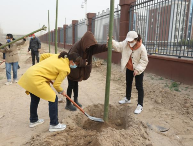 春风拂绿,植树现场一派热火朝天的劳动景象,党员干部们热情高涨、干劲十足,在党总支书记马春燕和院长张虎的带领下,大家来到植树点,三五成组,分工协作,一起挥锹铲土、运苗栽植、填坑夯苗、提桶浇水,每道工序都认真细致、一丝不苟,各环节都衔接有序、相互配合。在大家的共同努力下,一棵棵树苗顺利“安家落户”,迎风挺立, 每两人认领一颗树,寓意与树一同成长,并制作专属卡片挂在树上。马春燕强调,各位党员教师要以身作则、真抓实干、敢于担当,务实功、出实招、求实效,充分发挥党员先锋模范带头作用。