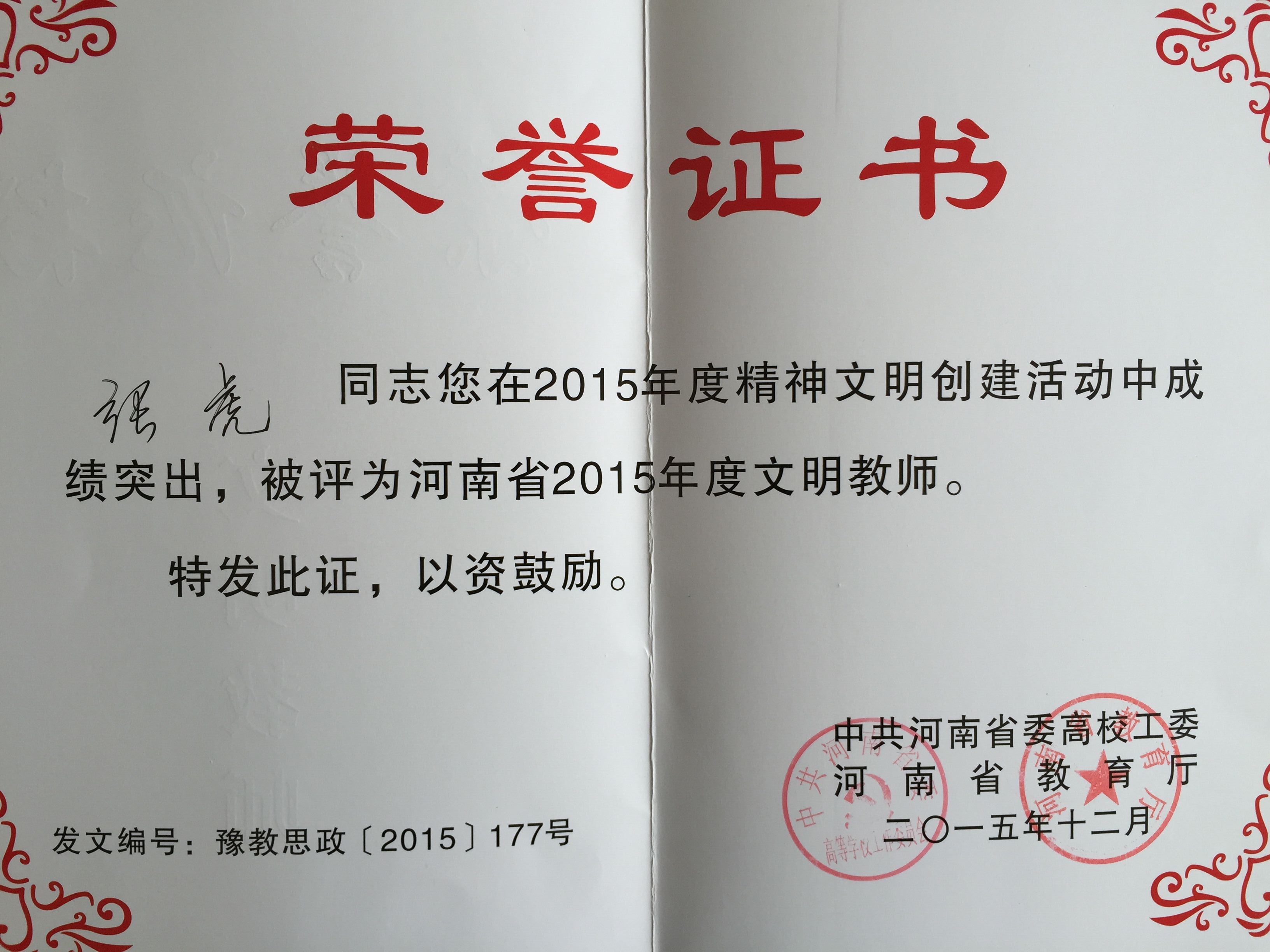 张虎,男,汉族,现任建筑工程系主任。张虎同志在2015年度精神文明创建活动中成绩突出,被评为河南省2015年度文明教师荣誉称号。