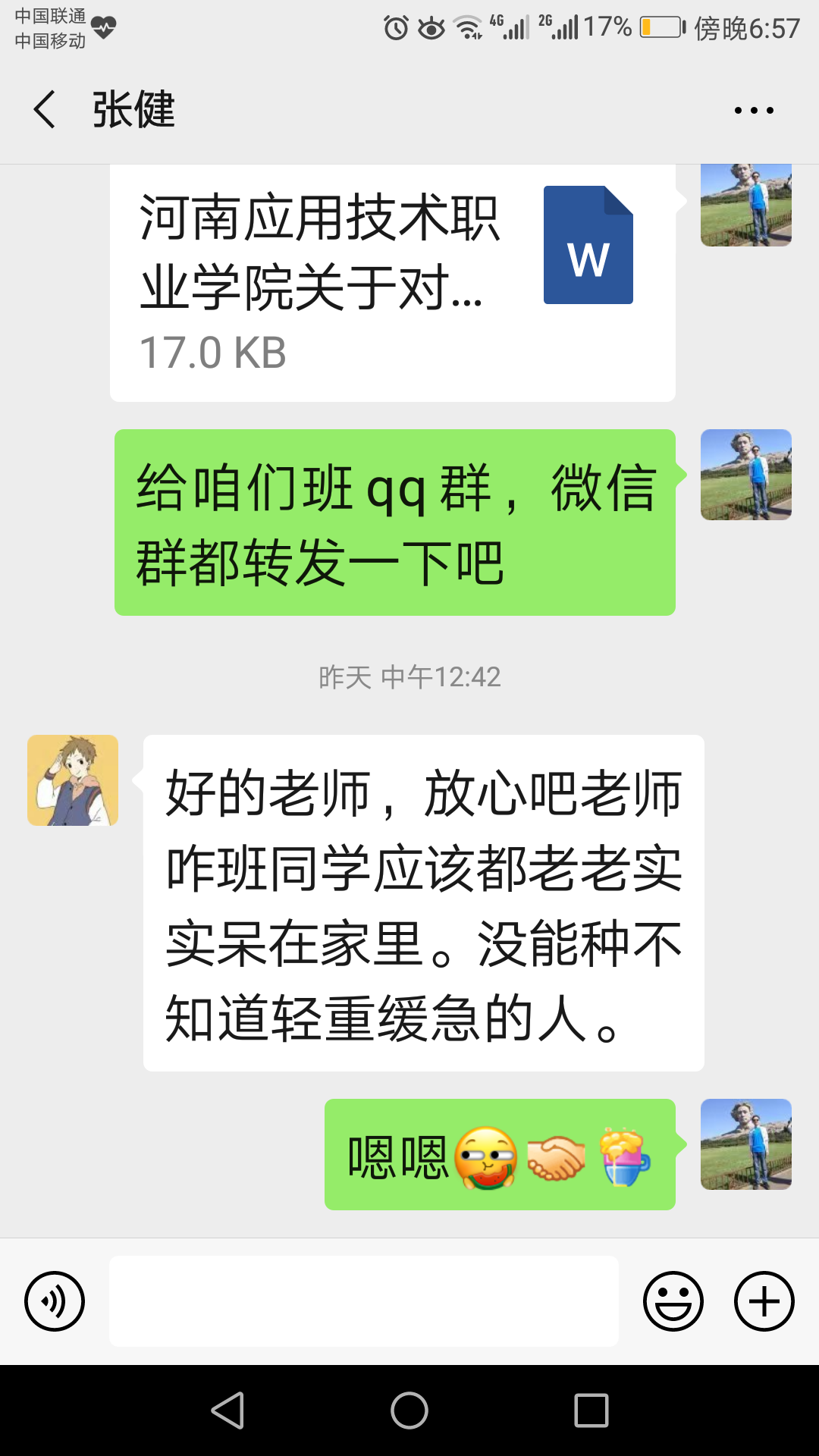 伟德官网建筑工程学院的辅导员们按照学校和马春燕书记的工作部署要求,勇担使命,竭尽所能,尽献微光。他们作为一线战“疫”员,忙碌在自己的工作岗位上,密切关注、关心学生近况。认真落实好“日报告、零报告”制度,建立了本班疫情防控学生信息台账,每日摸排学生状况、统计上报疫情数据、每日问候湖北学生、每日在班级群第一时间转发分享疫情变化和相关时事新闻,提醒班级同学做好疫情防护工作,对学生进行思想引导和心理疏导,与学生沟通缓解紧张情绪,与家长联系争取工作支持。对网上恶意传播和扭曲疫情信息所造成的恐慌等现象,积极发声,及时辟谣,教育同学们不信谣、不传谣,宣传合理的防疫措施,让学生认识到每个人都是自身健康的第一责任人,务必做好自我防护。