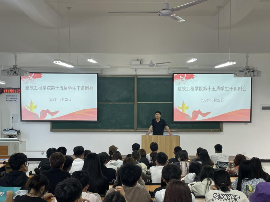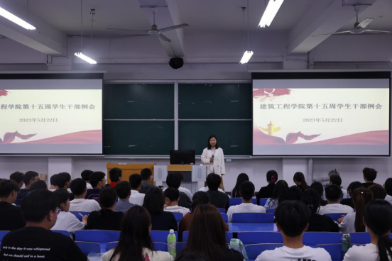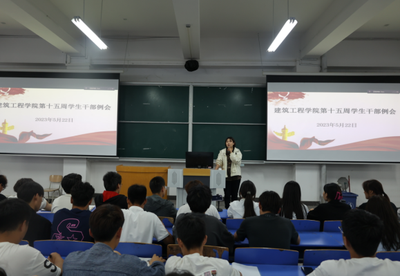 为提高学生干部积极性、主动性以及学生干部的综合素质,为学生提供更好的服务。2023年5月22日中午,建筑工程学院在郑州校区B201教室召开了第十五周学生干部例会(开封校区以视频形式在C201教室参加会议)。会议由建筑工程学院辅导员李慧杰主持,党总支副书记刘亚娟,辅导员宋春磊、李政、张慧以及学生会全体成员、各班班长和团支书参加此次会议。