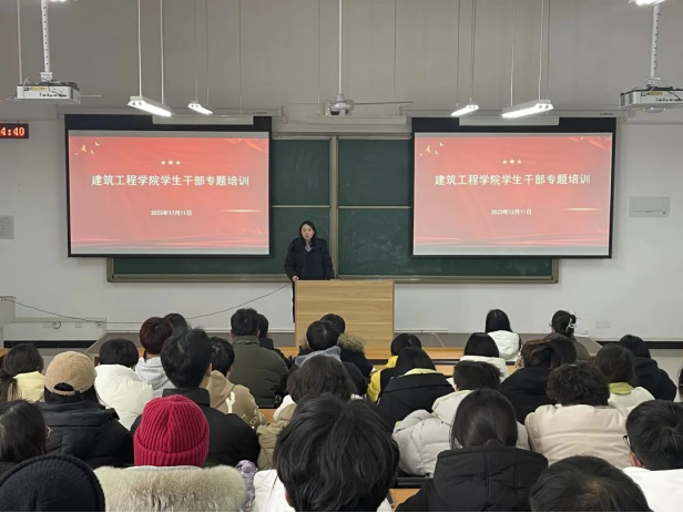 2023年12月11日,建筑工程学院在开封校区A101(郑州校区B101)教室组织召开“赋能成长,蓄势前行”学生干部专题培训会议。培训由建筑工程学院党总支副书记刘亚娟主讲,学院学生干部参加培训。