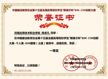 2023年11月 第十五届全国高等院校学生“斯维尔杯”BIM-CIM创新大赛一等奖