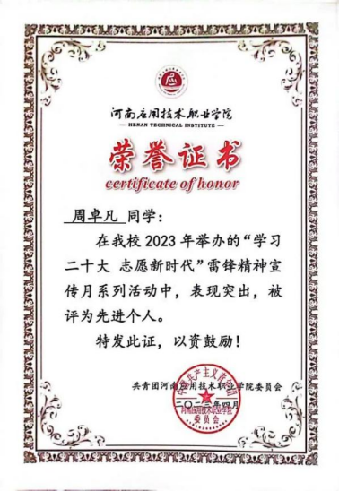 在日常生活中,该生注重自身品德修养,践行社会主义核心价值观。以诚实守信、团结友爱、助人为乐为行为准则,积极关心和帮助身边的同学。积极参与学校的各项思想教育活动,如“学习二十大 志愿新时代”雷锋精神宣传月系列活动等,在活动中不断提升自己的思想境界。