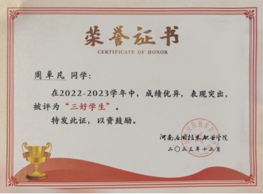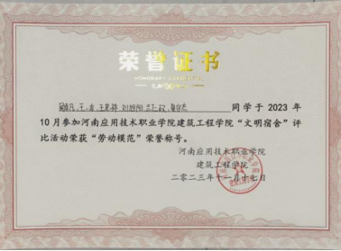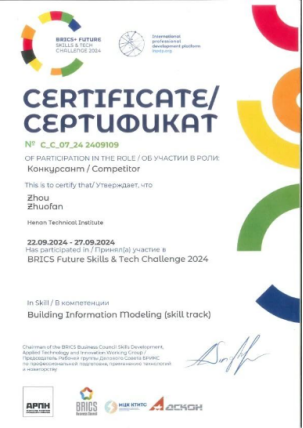 从大一开始,该生就怀揣着对知识的渴望和对未来的憧憬,全身心地投入到学习当中。他深知大学是一个知识的宝库,每一门课程都是通往成长的阶梯。在课堂上,他总是去坐前排,认真听讲,积极回答问题,与老师们互动交流。课后,他会主动复习所学内容,整理笔记,确保真正掌握了每一个知识点。该生深知实践对于专业学习的重要性,因此积极参加各类专业竞赛。2023 年 12 月,在河南省职业院校技能大赛装配式智能建造中,凭借扎实的专业知识和出色的实践能力,荣获一等奖。为了准备这次比赛,他投入了无数个日夜进行刻苦训练,反复钻研比赛规则和技术要点,与团队成员共同探讨解决方案。同年 11 月,在河南省“建美中原”大赛中获得二等奖。2024 年6 月的金砖国家职业技能大赛第三赛区区域赛取得了二等奖的好成绩。7月在金砖国家职业技能大赛国赛中,他不畏强手,奋勇拼搏,斩获二等奖。此外,2023 年 11 月的第十五届“斯维尔”建筑大赛中,勇夺一等奖。这些竞赛经历不仅让他提升了专业技能,还培养了他的团队协作精神和创新思维能力。在学习的道路上,该生将继续保持勤奋努力、积极进取的态度,不断追求卓越,为实现自己的人生目标而努力奋斗。积极参加各类省级以上职业技能比赛和创新创业比赛,在比赛中锻炼自己的实践能力和创新思维。通过不断挑战自我,积累了丰富的比赛经验,提升了专业技能水平,在未来的学习道路上,该生将继续保持积极进取的态度,不断提升自己的专业技能和综合素质,为实现自己的人生目标而努力奋斗。