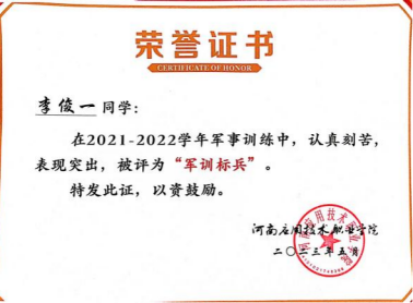 2023年05月,获得伟德国际英国2023年度军训标兵