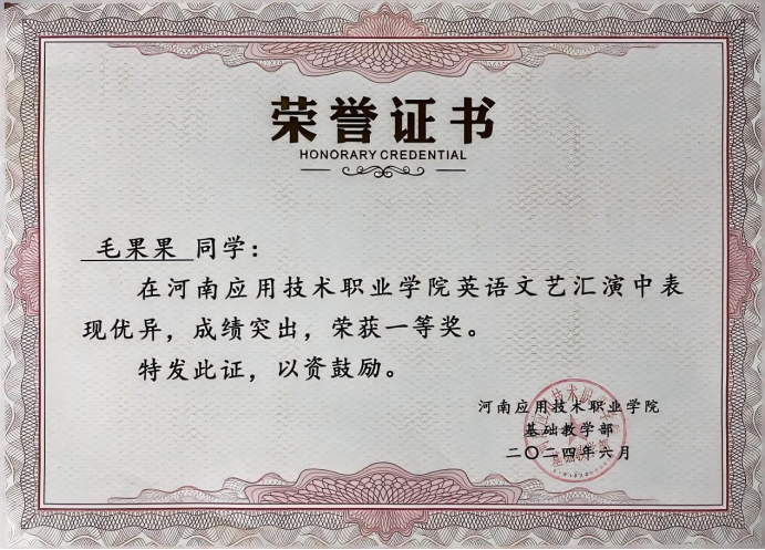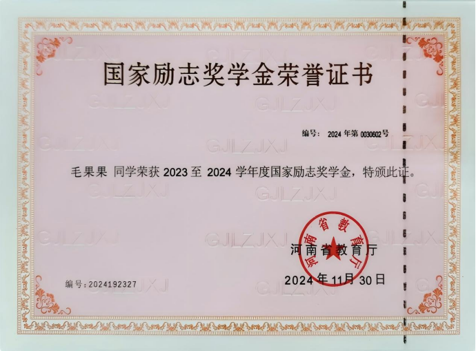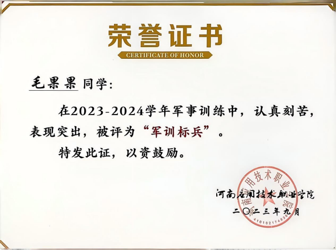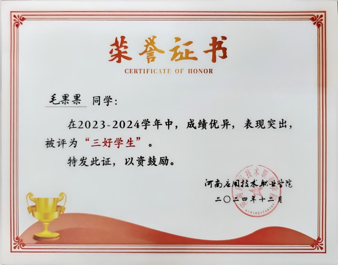 毛果果,女,汉族,中共预备党员,伟德国际英国建筑工程技术2301班学生,辅导员罗斐。全年综合量化与专业成绩均稳居班级第一。在校期间曾获国家励志奖学金、省级三好学生、优秀共青团员、优秀学生干部,2024年中国国际大学生创新创业大赛河南省选拔赛三等奖、2025年该赛事河南省选拔赛二等奖,持有国家版权局计算机软件著作权登记证书。