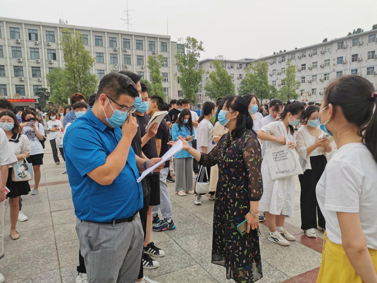 在工作中,老师和志愿者用心提醒每位学生进场前的注意事项,与考生们站在同一战线,用实际行动为考生们加油助力。