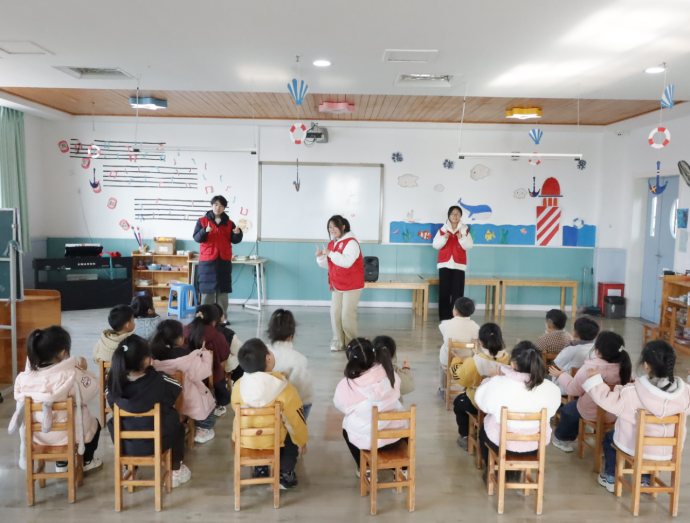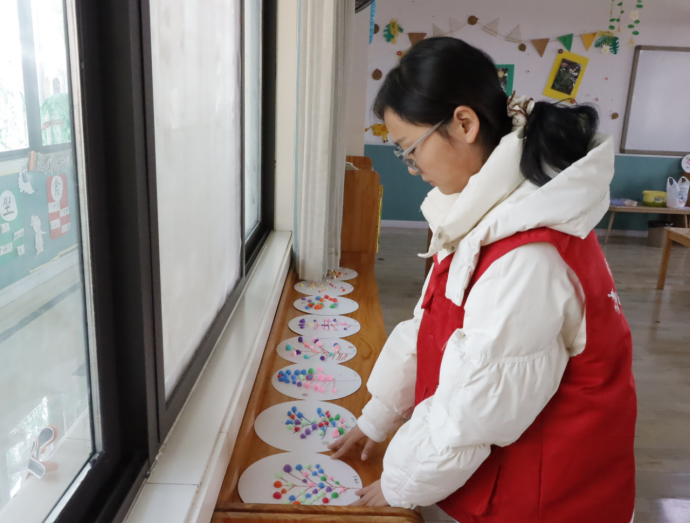 小筑志愿者们用活力驱散寒意,用巧思点亮童心,为幼儿园的小朋友们打造了一堂充满欢乐与温暖的趣味课堂,让志愿精神在冬日的校园里熠熠生辉。舞蹈教学时,小筑志愿者们将《红山果》欢快的旋律拆解成简单易懂的舞步,小筑志愿者会弯腰手把手指导,逐句引导孩子们学唱伴舞,鼓励他们大胆舒展肢体并且收获了专属贴纸的鼓励,稚嫩的笑声伴着欢快的旋律在教室回荡。