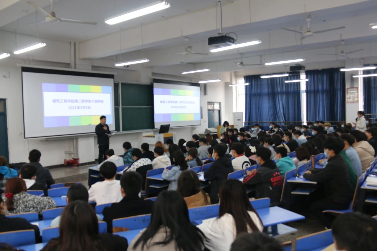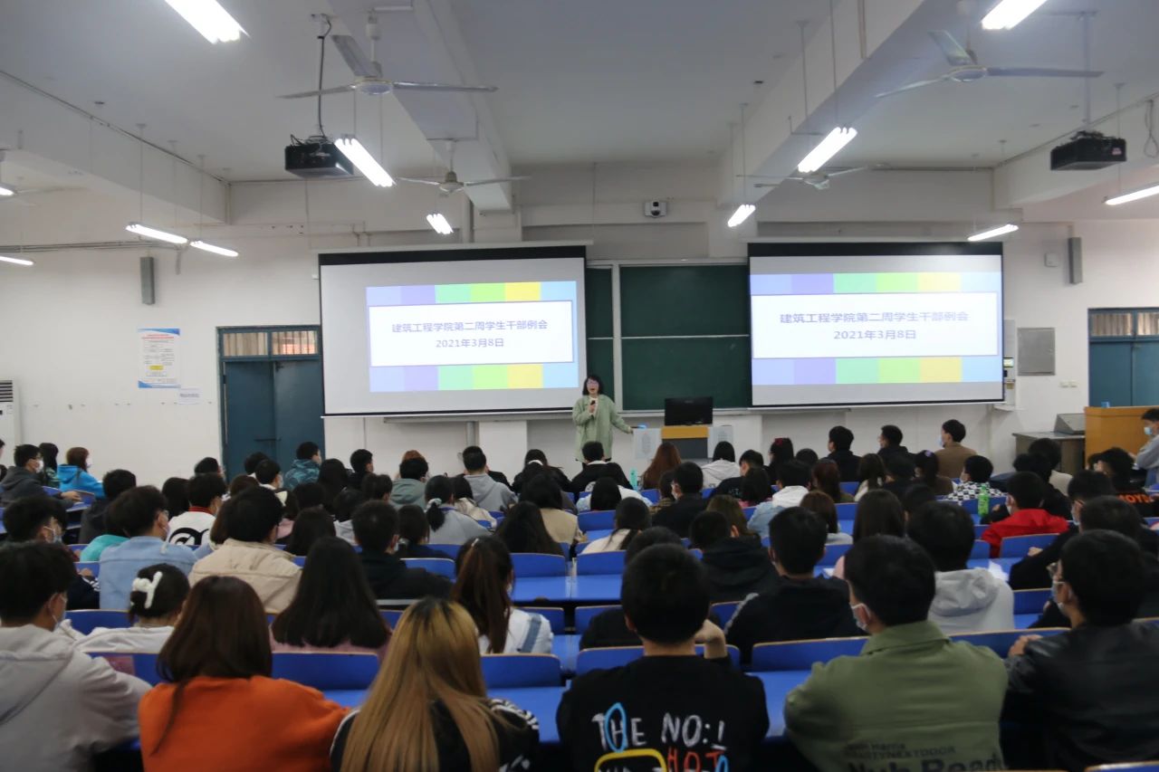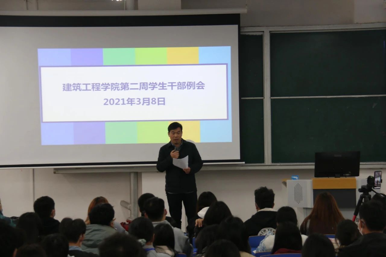 为提高小筑们的积极性,提升工作和学习的效率,建筑工程学院于2021年3月8日中午12:30,在B楼102教室召开了建筑工程学院第二周学生干部例会,(东校区以视频会议方式参加),参与本次会议的有刘高喜老师、刘亚娟老师、李慧杰老师、孙雪理老师、团学会全体成员、入党积极分子及各班班长、团支书。