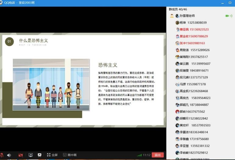 各班级班会通过线上形式学习《中华人民共和国反恐怖主义法》相关知识、观看反恐安全知识视频。并通过国际上的恐怖袭击案例来为同学们讲解了恐怖暴力的手段表现、反恐防暴相关法律法规、反恐防暴应对措施以及受伤后的自救方法等内容。各班级辅导员围绕班会主题,给同学们讲解了公民安全防范常识,如何对暴力恐怖犯罪线索进行举报等反恐怖常识,及一些应对暴力恐怖袭击的原则和应对策略。针对同学们的实际情况,共同总结与分析面对紧急事件的方法,重点强调了如遇到砍杀袭击、纵火、爆炸、枪击、劫持等暴力袭击事件时,应第一时间报警并寻找安全位置,不围观、不靠近,并一定要保护好自己;如遇可疑人跟随,一定要避免走无人的小巷,并迅速到就近的派出所报警。