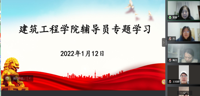 为加强辅导员队伍建设,进一步引导学院辅导员准确把握工作规律,切实提高工作能力和专业素养,激励辅导员更好践行“为党育人、为国育才”的使命担当。2022年1月12日晚,建筑工程学院组织2019级、2020级、2021级全体辅导员观看了新时代高校辅导员要思考与答好的“四个问题”主题讲座。