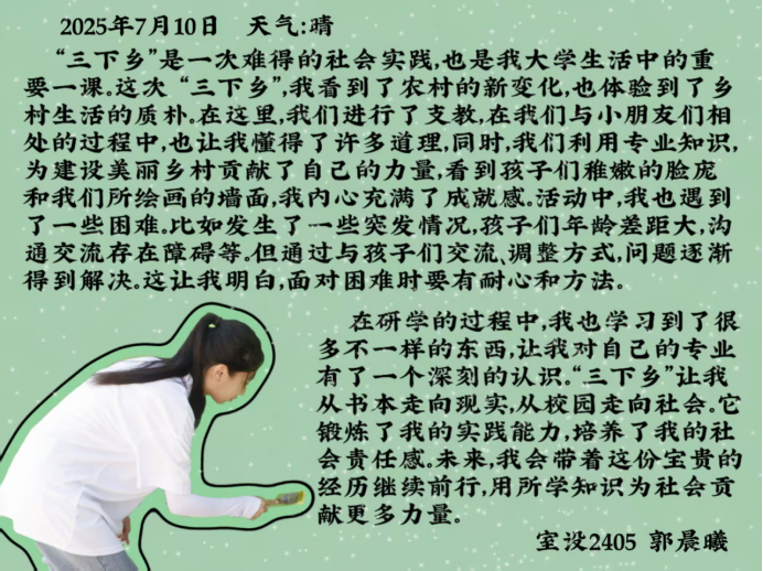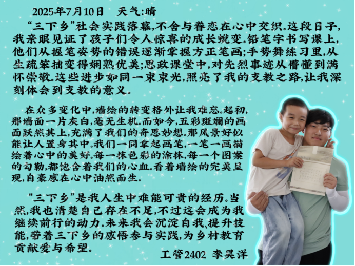 建筑工程学院“小筑”志愿服务队暑期“三下乡”社会实践的余热尚未褪去,队员们带回的不仅是兰考大地的风尘,更有浸润在乡土里的思考与成长。从支教课堂上的童真互动,到墙绘现场的协作攻坚,从博物馆里的古今对话,到与村民攀谈时的质朴共鸣,不同的实践场景里,藏着同样滚烫的收获。让我们继续倾听他们在乡土间播撒青春、收获感悟的故事。